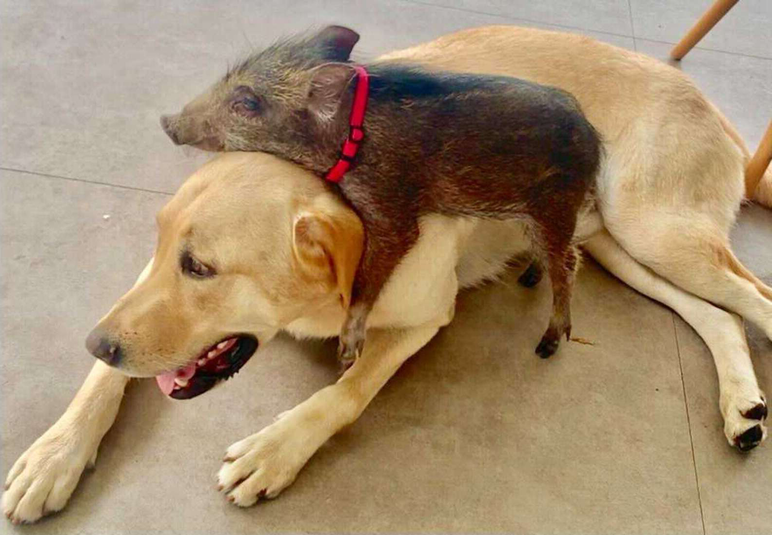 ▼Yezhu很喜歡狗狗們,尤其是其中的一隻拉拉。牠總是跟在拉拉身後,跟牠一起玩耍、一起休息。牠可能以為自己也是一隻狗狗吧。
