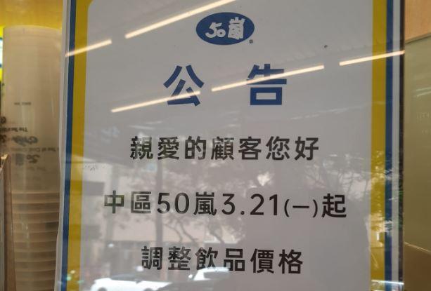 50嵐在各大城市均有門市,因為營運策略因素,所以50嵐各地區的價格略有不同。今年3月1日起,50嵐針對北北基地區,率先調漲部份飲品售價5元,現在中區50嵐也要調整飲品售價了。