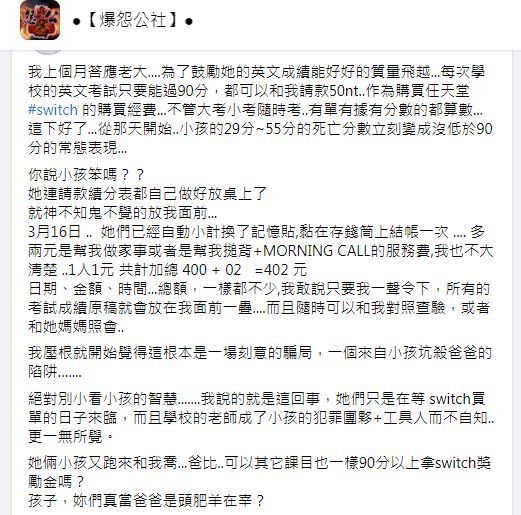 ▼原po說:「上個月答應老大,為了鼓勵她的英文成績能好好的品質飛越,每次學校的英文考試只要能過90分,都可以和我請款50元,作為購買任天堂Switch的經費,不管大考小考隨堂考,有單有據有分數的都算數。」