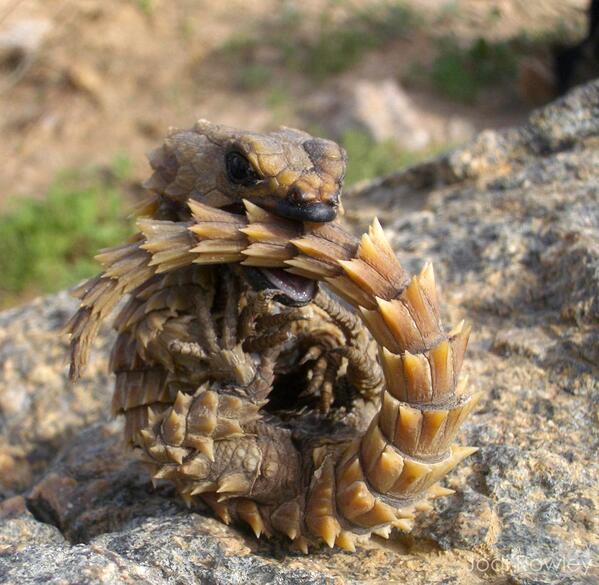 ▼犰狳蜥感到害怕時,會鑽到石頭縫裡,然後用嘴巴咬住尾巴,將自己縮成一個堅不可摧的圓環。這樣能保護柔軟的腹部。如果地理位置適宜,牠們還能順勢滾到別處,逃之夭夭。犰狳蜥奇怪的逃跑方式跟哺乳動物犰狳非常像,這也是牠們名字的由來。