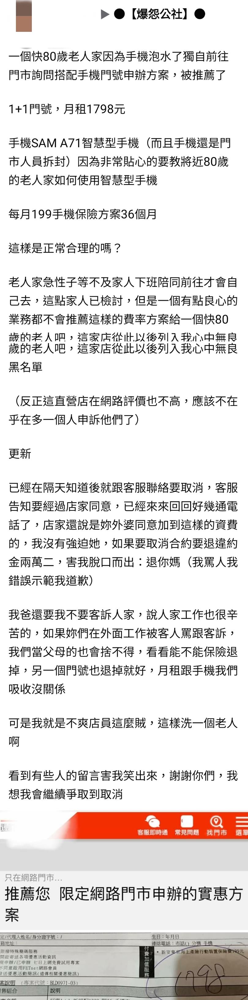 網友們看到後紛紛留言:「賺這種錢好嗎?良心安嗎?」、「這就宰肥羊的方式啊,沒天良」、「慫恿一個快80歲老人家辦月租1798元?這是不是太過份了」、「很差勁的店家、店員」、「客訴不要客氣,縱容這種人只會讓更多人受害,擺明就是看準老人家不懂啊!客訴下去就對了」。這樣對待一個老人家太過分了!