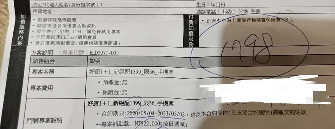 ▼店員看老人家不懂,推薦了很貴的「月租1798元的1+1門號」高資費方案,搭配三星A71手機,每個月199元的手機保險方案3年,而且手機是直接拆封的。