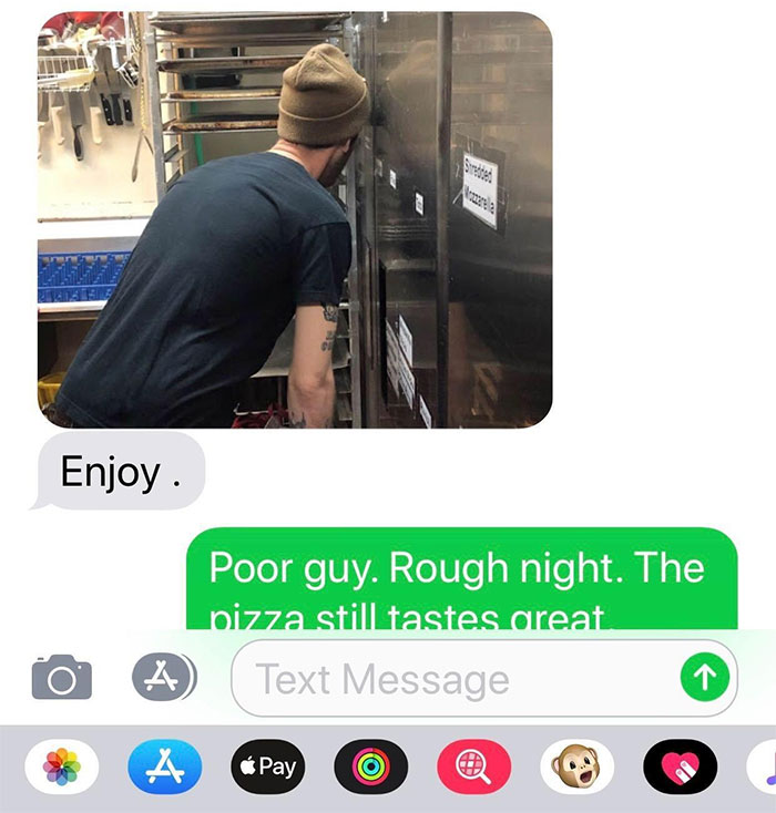 ▼老闆真的傳來照片,並說:「請盡情享受。」顧客開心表示:「可憐的傢伙~他有一個難熬的夜晚。不過披薩很好吃~」