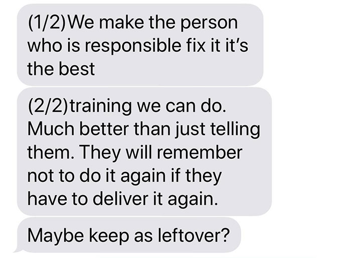 ▼那位顧客將照片傳給老闆,不是為了找外送員的麻煩,只是想提醒一下,所以他解釋說:「這讓我感覺很糟啊,不用給我送新披薩了,就告訴他,他很幸運,有一個非常有風度的顧客吧。」老闆只能按照顧客的意思辦,妥協說:「那好吧,我們會讓他在角落面壁思過的。」