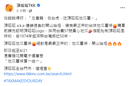 2022年03月24日連鎖速食龍頭麥當勞23日起正式開賣「金黃地瓜條」,吸引不少人朝聖。吃過的網友大讚味道好,還說比台式速食品牌始祖頂呱呱的地瓜薯條要好吃。頂呱呱不甘示弱,宣布即日起至4月21日止,只要憑電子優惠券,即可享地瓜薯條買1送1優惠。這明顯是跟麥當勞較勁。
