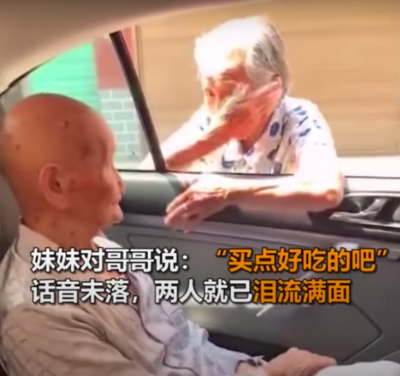 ▼哥哥剛剛坐進車裡,妹妹就追了出來。她拿出2張鈔票塞給哥哥,叮囑說:「買點好吃的吧!」這話剛剛說完,兩位老人的眼淚就不自覺落下來。也許他們想到了小時候的場景,也許他們都知道,按照彼此的年齡來看,這可能是最後一次見面了。
