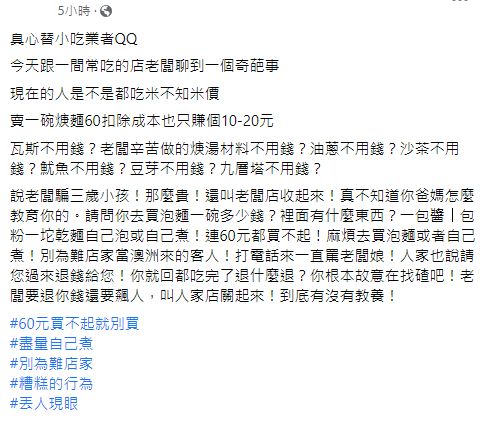 2023年06月25日日前一名男網友在臉書社團「爆廢公社公開版」分享說,一名小吃店老闆向他訴苦,日前遇到一名奧客嫌羹麵一碗賣60元太貴,不僅打電話到店裡狂罵老闆娘,還要老闆把店收起來。原po替老闆抱屈,列出成本氣罵奧客:「現在的人是不是都吃米不知米價?!」