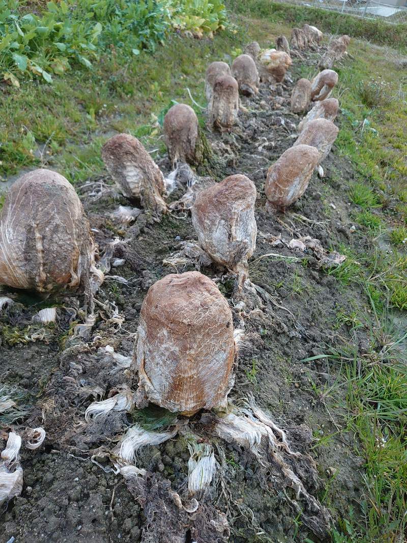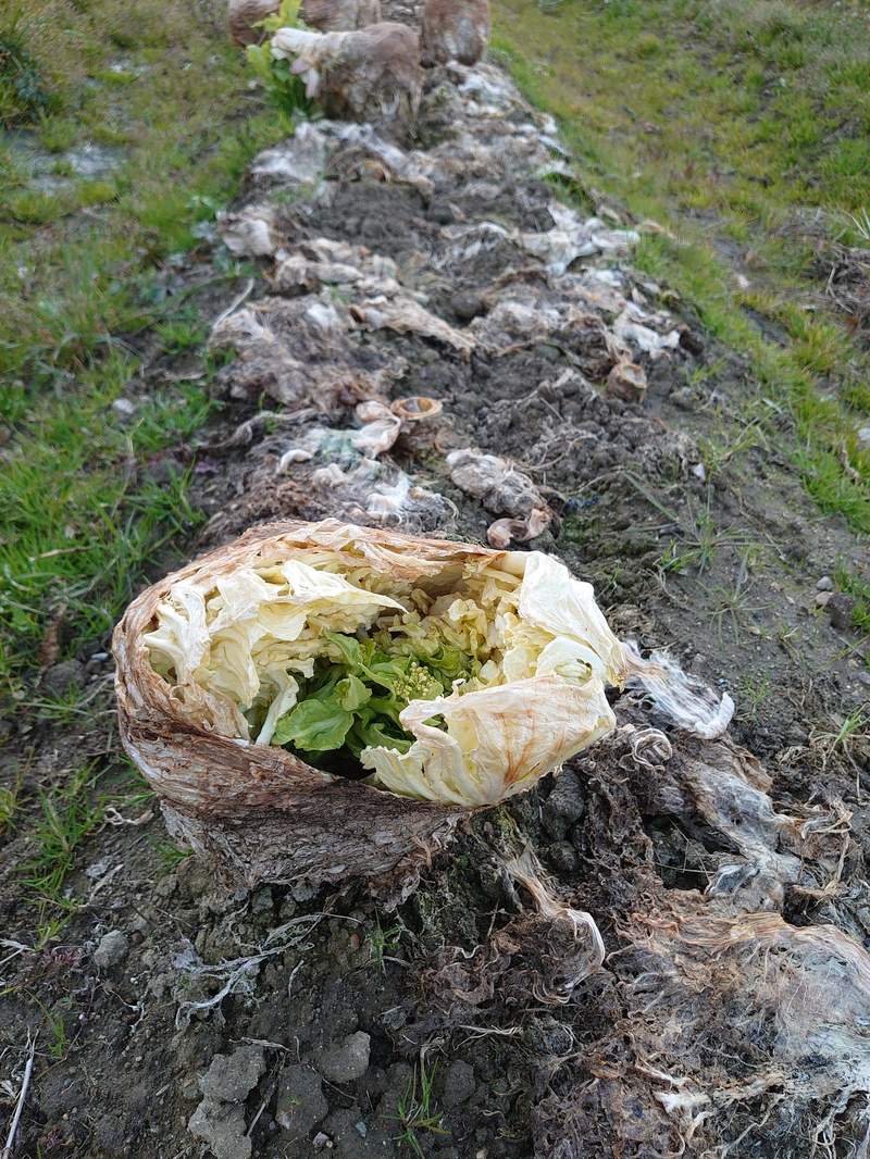 ▼這是推主在老婆家鄉的農田裡拍到的照片。冬天白菜外層菜葉細胞內的水分凍結,葉子枯萎就變成了異形蛋的模樣。這可是只有初春才能看到的限定風景。