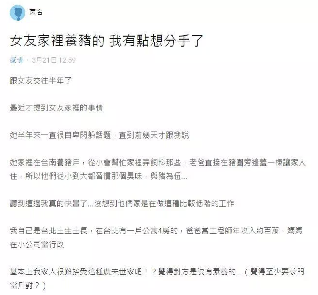 2022年03月25日因為女友家人的工作提分手?日前一名男網友在Dcard貼文,表示:「女友家裡養豬的,我有點想分手了。」原po說,他跟女友交往半年,才知道對方家中是養豬戶,「沒想到他們家是在做這種比較低階的工作」。他求助網友:「對於這段沒有結果的戀情要不要早點分手了呢?」