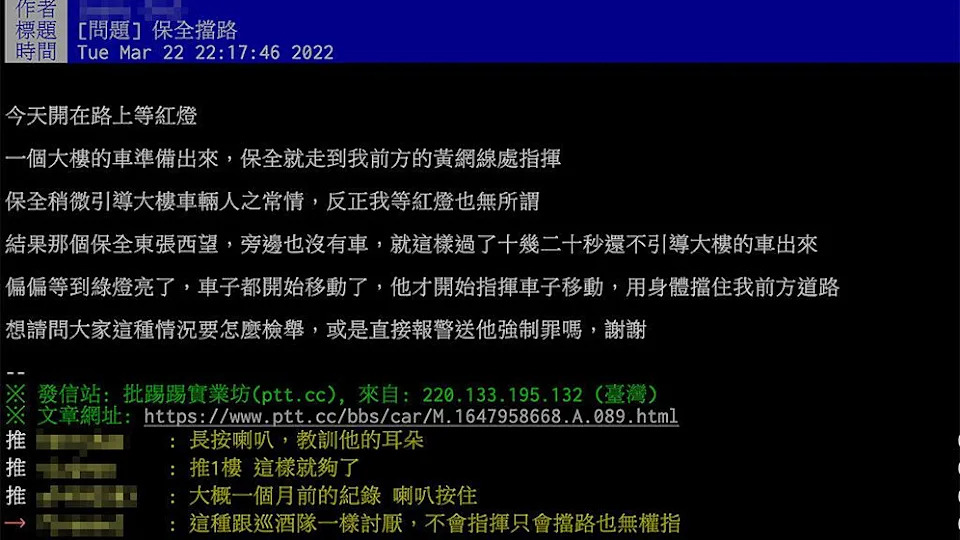 2022年03月29日很多人都曾遇到大樓保全跑到馬路上擋車,為住戶開路的情況。日前一名網友在PTT發文說,有一天他開車上路時被保全攔車,本以為住戶的車輛很快就會開出來,沒想到遲遲不見車輛出現。這讓他非常無奈,問:「這種情況要怎麼檢舉?」