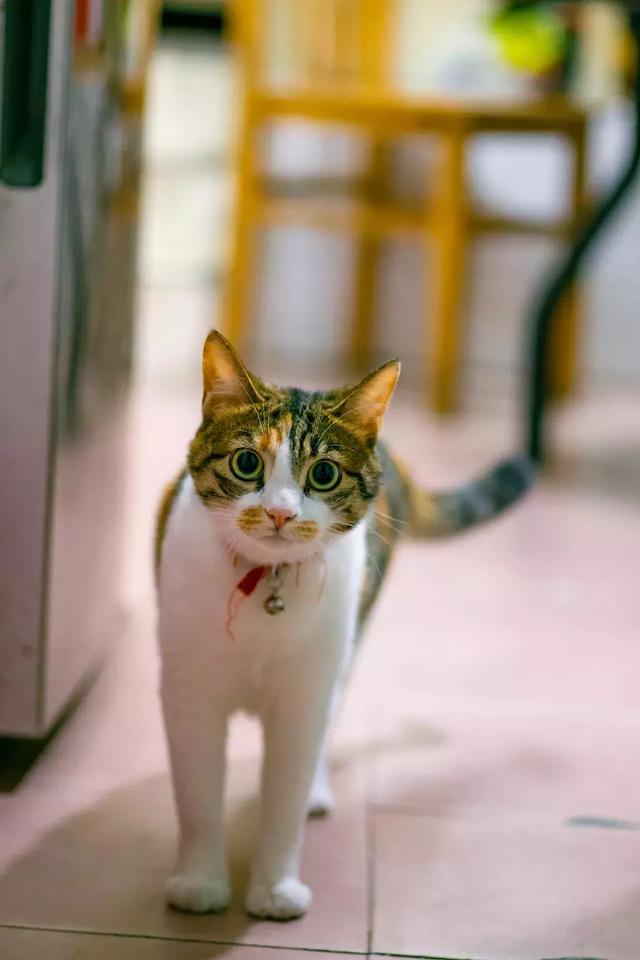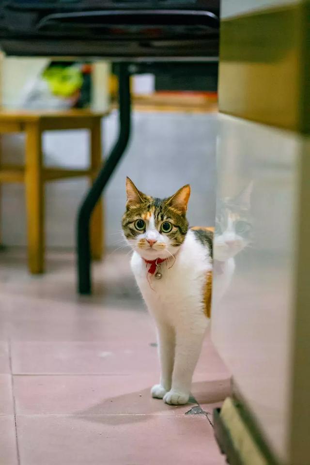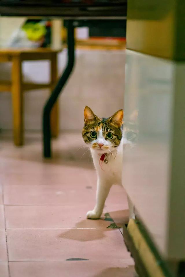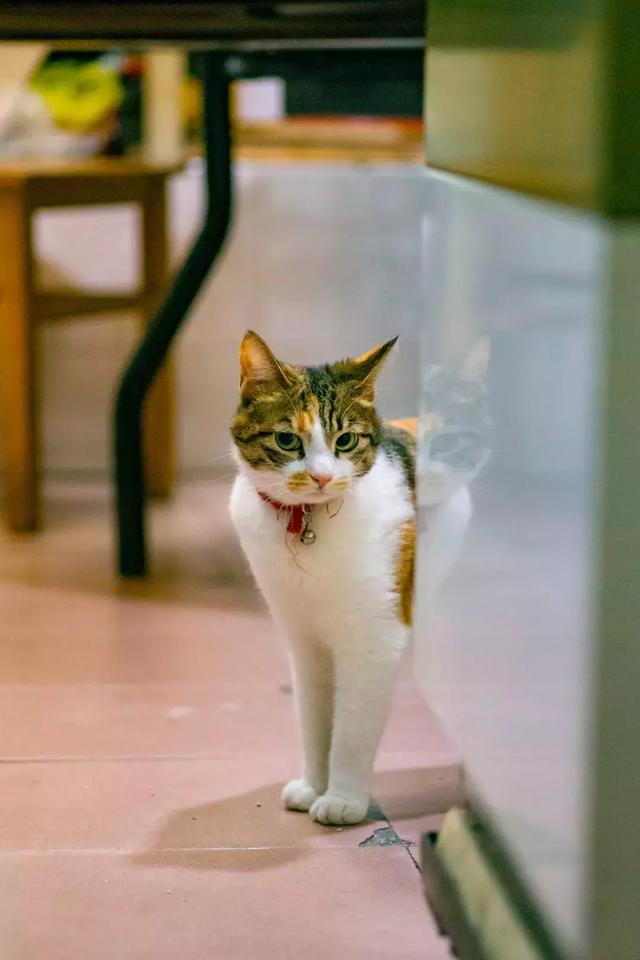 ▼貓咪悄悄從冰箱邊蹭過來,那透著睿智之光的眼神好像在說:「人類,本喵已經把你看透了!」