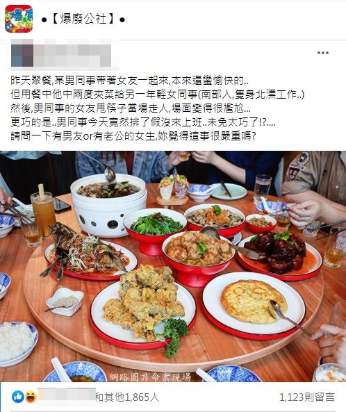 原po表示,前幾天他和公司同事一起聚餐,其中一名男同事帶女友一起來。大家一邊吃飯一邊聊天,剛開始現場的氣氛很愉快,沒想到期間那名男同事兩度夾菜給一名年輕女同事。這名女同事是南部人,隻身北漂工作。
