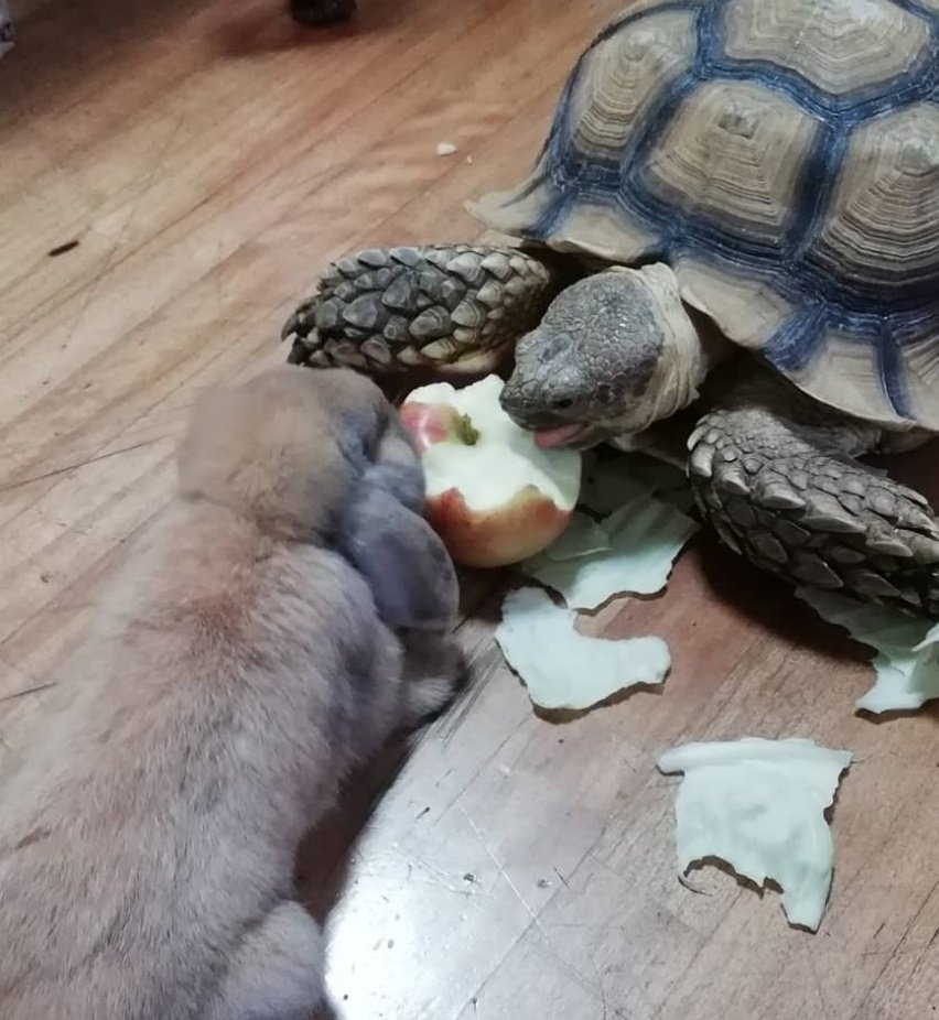 ▼而這組相片目前已經累積到了14萬多的讚、1.8萬次的轉推,引起網友的熱烈討論,有網友也分享了自家烏龜和兔兔一起共享一顆蘋果的樣子,怎麼以吃的面積來看起來,烏龜那邊吃的比較快呢!