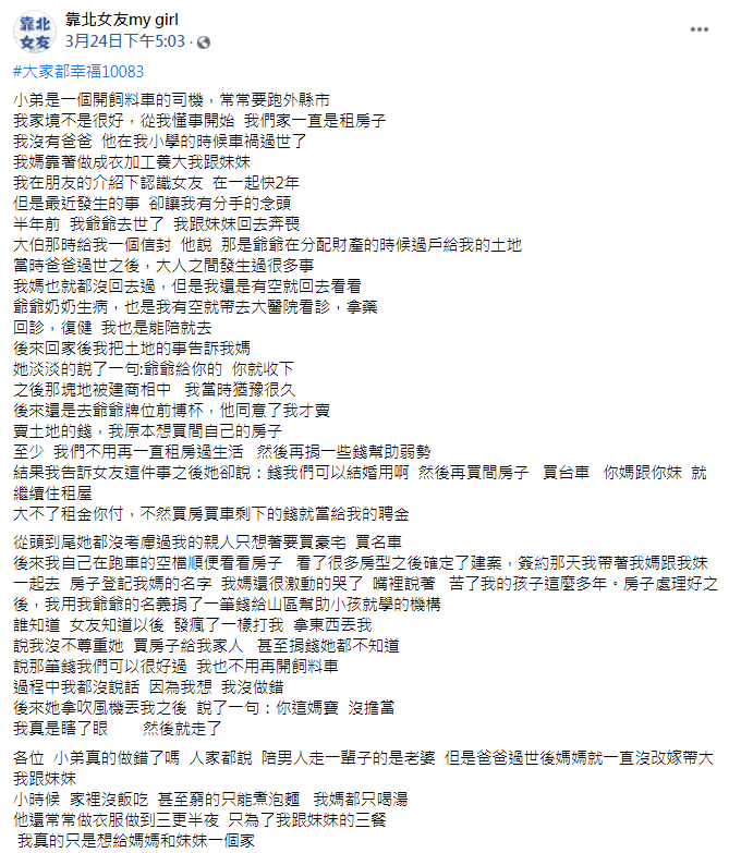 半年前爺爺離開後,留給原po一塊土地,女友知道後說:「錢我們可以結婚用啊,然後再買間房子、買台車,你媽跟你妹就繼續住租屋,大不了租金你付,不然買房買車剩下的錢就當給我的聘金。」原po不捨得家人租屋生活,決定把土地賣掉,給母親買房,剩下的錢則以爺爺的名義捐給慈善機構,幫助山區孩童就學。