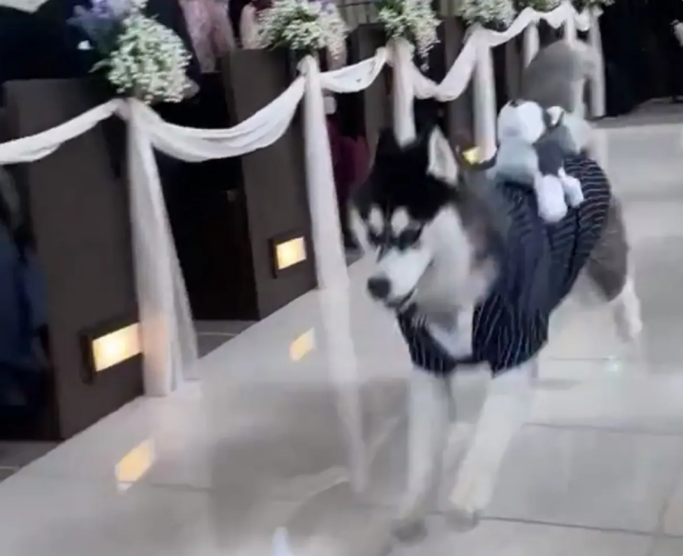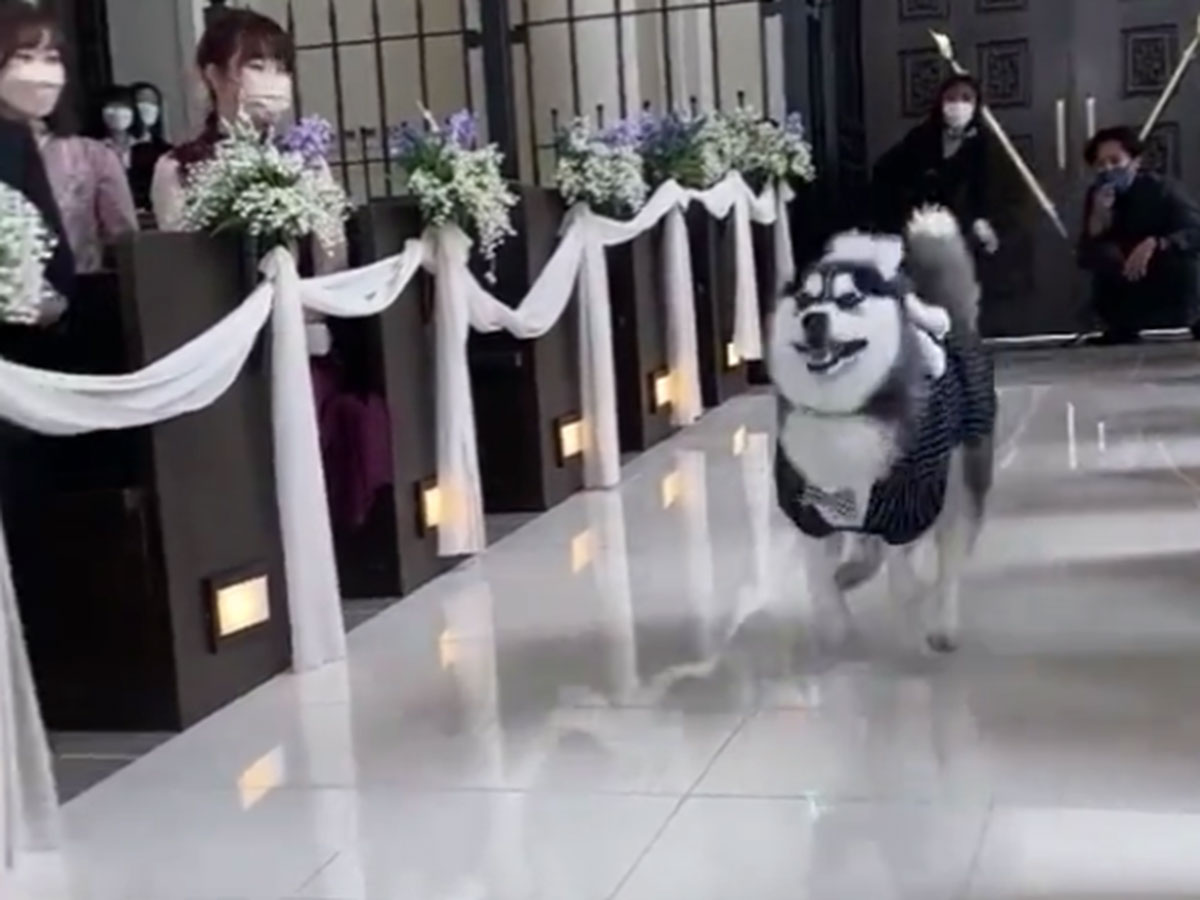 主人心臟很大!讓哈士奇「當婚禮戒童」 一鬆手牠暴衝上台:以後就是家人啦♡