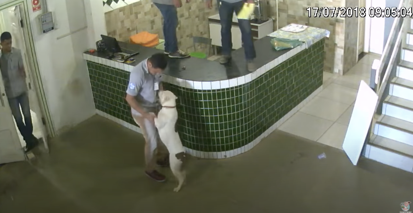 2022年04月04日熱情的狗狗很討喜,但怕狗的人遇到太主動的狗狗,就有不一樣的體驗了~2018年時,巴西羅迪尼亞鎮(Rodnia)的一間餐廳中出現了有趣的一幕。當時一群裝潢工人正在餐廳內忙碌,一隻牛頭梗突然闖進來。裝潢工人嚇了一跳,立刻落荒而逃。狗狗還以為他們在跟自己玩,狂搖尾巴看起來很開心。