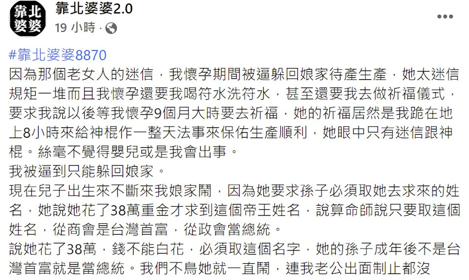 原po表示,她的婆婆非常迷信,因此她在懷孕期間被迫躲回娘家待產。婆婆曾要求她用符水洗澡或喝符水,還要她懷孕9個月時前往進行祈福儀式,儀式的內容竟是要她跪在地上長達8小時來讓神棍做法,以祈求生產順利。原po無奈說:「她眼中只有迷信跟神棍,絲毫不覺得嬰兒或是我會出事。」