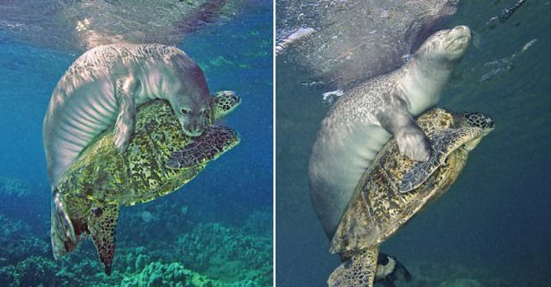 2022年04月05日動物世界經常會有感人的畫面出現!2017年時,攝影師Beat Korner在美國夏威夷海岸附近看到了罕見的一幕。只見一隻海豹趴在海龜背上,久久不願離開,似乎是在搭便車。Korner覺得很有趣,靠近看了一下,這才發現海豹是在幫助那隻被困的海龜。