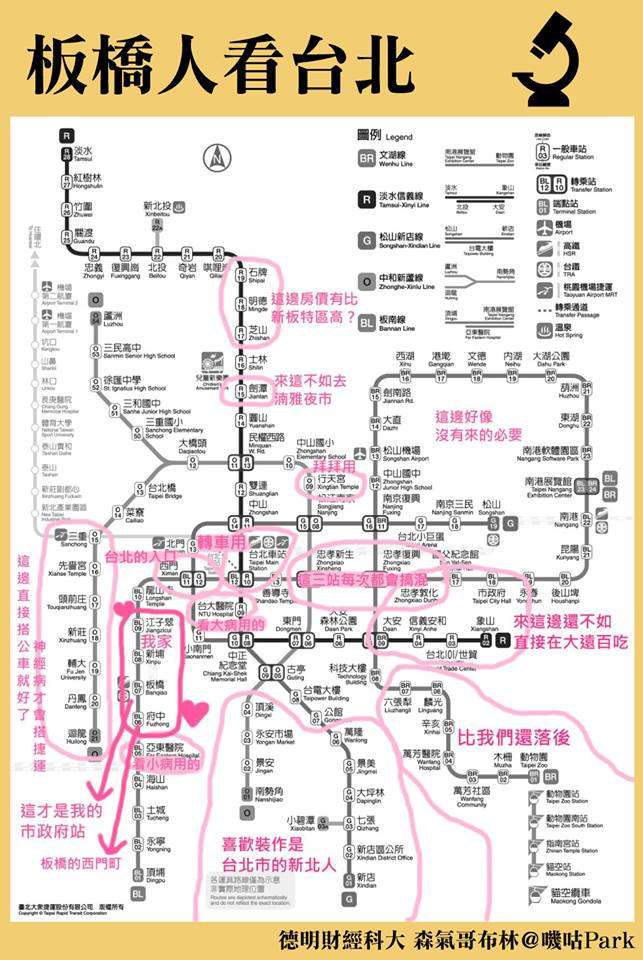 ▼還有板橋人出面表示,在他們眼中,新北市府所在的板橋才算市中心!地圖上標註:「台北車站只是轉車用」、「內湖地區沒有去的必要」、「六張犁到動物園那段很落後」、「去士林夜市不如去湳雅夜市」、「天母房價有比新板特區高嗎?」、「府中市板橋的西門町」、「新莊三重直接搭公車就好了,神經才會搭捷運。」