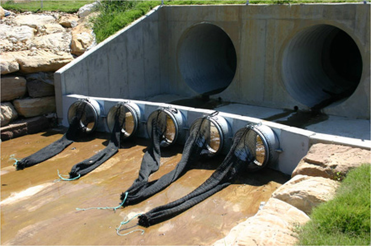 ▼這些網被安置在居民區和自然區之間的排水管出口上。垃圾被沖到這裡,就會被網兜住。