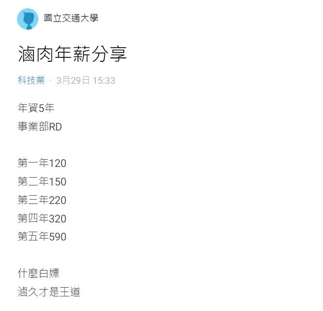 ▼原po表示,自己在事業部擔任RD,「第一年120萬元,第二年150萬元,第三年220萬元,第四年320萬元,第五年590萬元」,幾乎翻了近6倍。他興奮直呼:「滷久才是王道!」原po還透露,聯詠的新人都是統一價「安慰獎10萬元,加點班就有120萬元啦」。