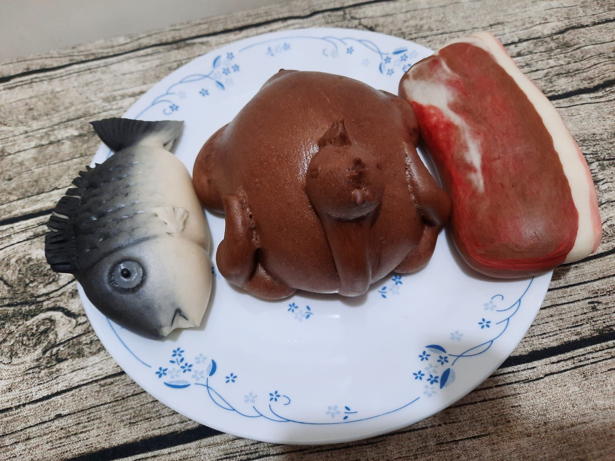 ▼原po表示,清明節時,她用麵粉等材料做了三牲造型饅頭,「養了兩隻雞、釣了兩條魚、醃了兩塊肉」。從照片中可以看到,盤子上擺著魚、全雞和豬肉。第一眼看去,還以為這是一般的三牲,但仔細一看就會發現,這都是自製的可愛版本牲禮。