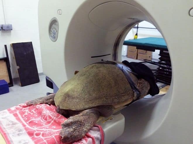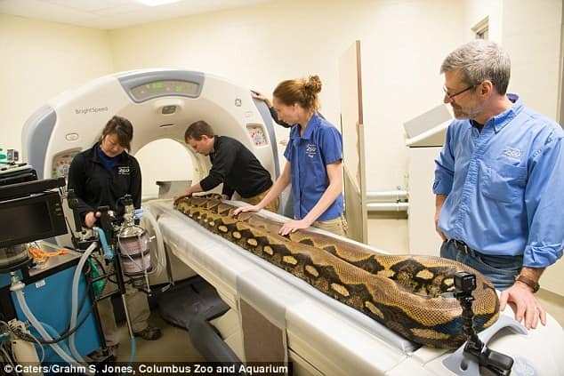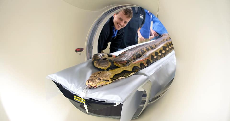 ▼蟒蛇做CT檢查更搞笑。牠身體細長,沒辦法直接放進去,所以工作人員將牠對折一下,真的很節省空間呢。