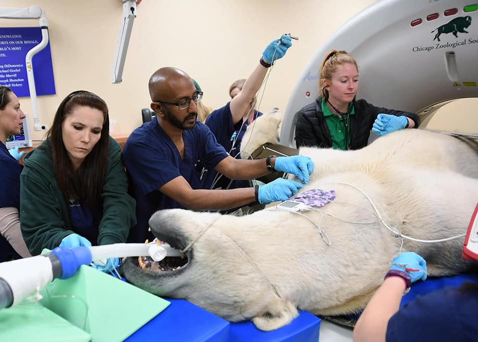 ▼北極熊體型龐大,四仰八叉躺在檯面上,被工作人員順利塞進了機器裡。