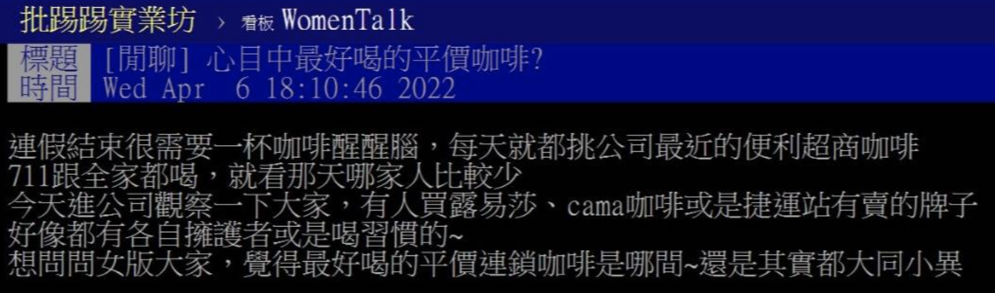 ▼原po表示,連假結束後,真的很需要咖啡醒腦。平時他都是到公司附近的便利超商買咖啡,看哪間人少就買哪間。不過進公司後,他注意到很多同事都是在連鎖咖啡店消費。「有人買路易莎、Cama咖啡或是捷運站有賣的牌子,好像都有各自擁護者或是喝習慣的」。最後他問大家,覺得最好喝的平價連鎖咖啡是哪間?還是口味其實都差不多?