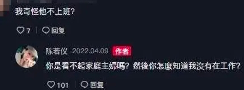 陳若儀看到後不甘示弱,反嗆說:「你是看不起家庭主婦嗎?然後你怎麼知道我沒有在工作?」網友們看到後紛紛為她的高EQ霸氣回擊按讚。
