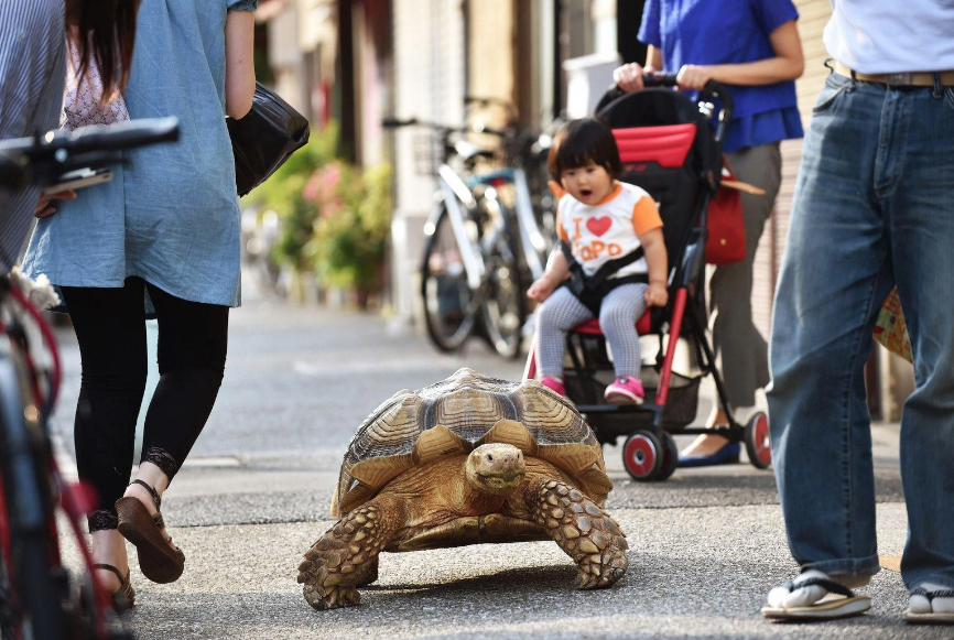 沒想到在東京也會看到這樣的奇景,「一人一龜」在街頭漫步的畫面真的好療癒!如果你有機會去東京,說不定也可以遇到他們喔!