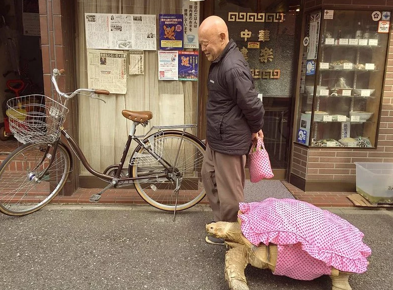 日本老爺爺街頭「遛龜」成奇景 帶70公斤老朋友散步引路人圍觀