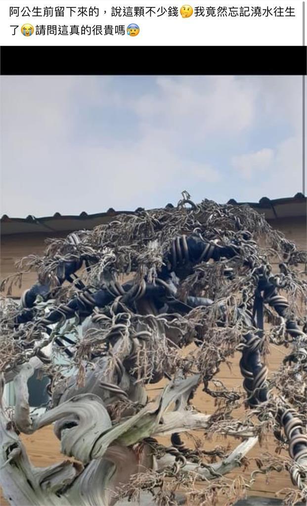 原PO表示,因為自己忘記澆水,導致家中的盆栽枯死了。他曾聽阿公說過這棵真柏價值不菲,所以他連忙上網詢問:「阿公生前留下來的,說這棵不少錢,我竟然忘記澆水往生了,請問這真的很貴嗎?」