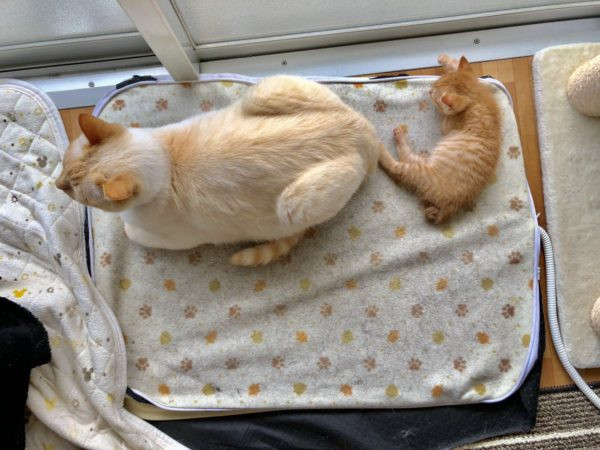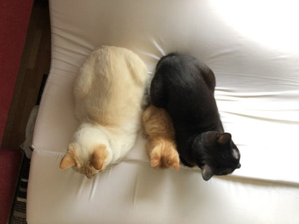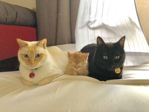 2022年04月13日家有三隻可愛小喵的日本網友,經常在推特帳戶「 イチそらあめ」上分享三小隻的日常照片,牠們每天朝夕相處親密無間,不知情的人還以為牠們已經在一起生活了好幾年,但其實最小的那隻咖色小貓是今年5月初才來到家裡的流浪貓,沒想到很快就和同屋的兩隻大貓玩成了一片。