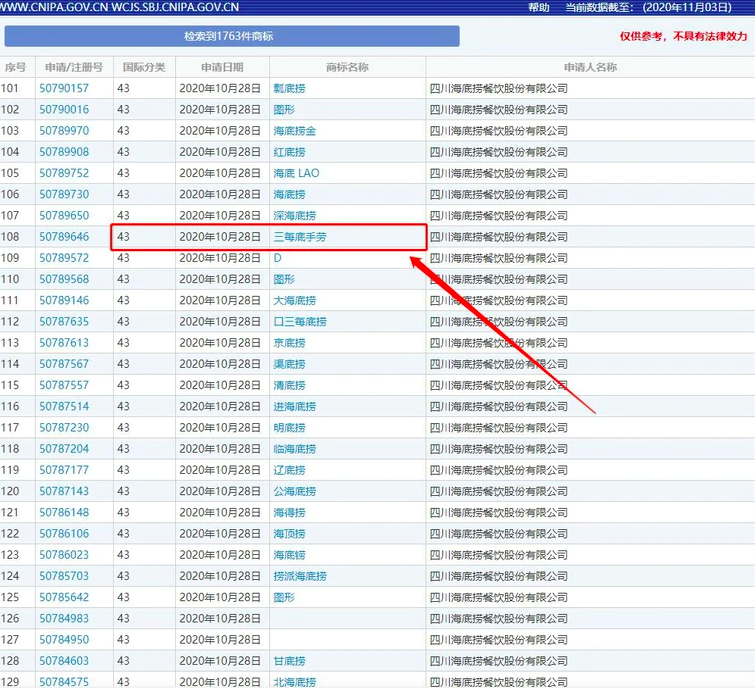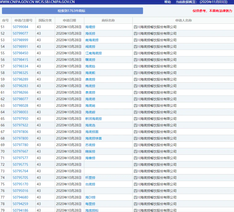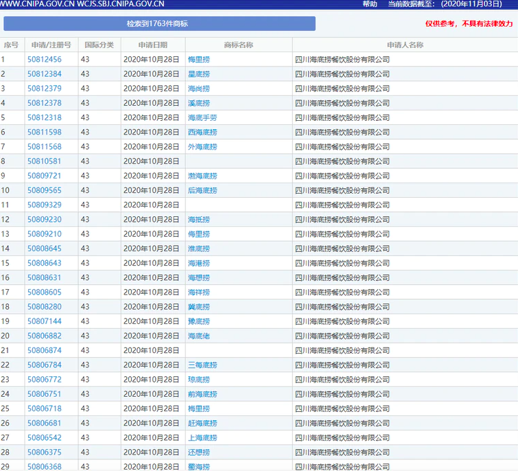 ▼根據大陸企業訊息查詢網站「天眼查」的資料,海底撈從10月28日開始註冊新商標,其中包括「海底煎」、「海底挑」、「海底淘」、「海底撿」、「新海底撈」、「渠底撈」、「池底撈」、「還想撈」、「海滴撈」、「海港撈」、「洋底撈」、「塘底撈」、「溪底撈」、「瓢底撈」等等。就連「三每底手勞」這個商標名都註冊了!