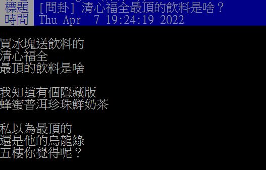 ▼原po說:「買冰塊送飲料的清心福全,最頂的飲料是啥?我知道有個隱藏版,蜂蜜普洱珍珠鮮奶茶;不過個人以為最頂的,還是他們的烏龍綠,你們覺得呢?」