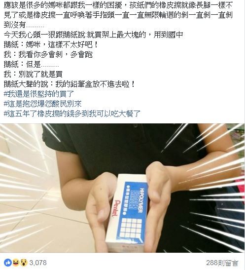 ▼這位媽媽買了一個「跟手掌一樣大」的橡皮擦!她表示「用到國中,我看你多會剝、多會跑!」,就算兒子表示鉛筆盒放不下還是堅持要買,「五年了,橡皮擦的錢多到我可以吃大餐了!」