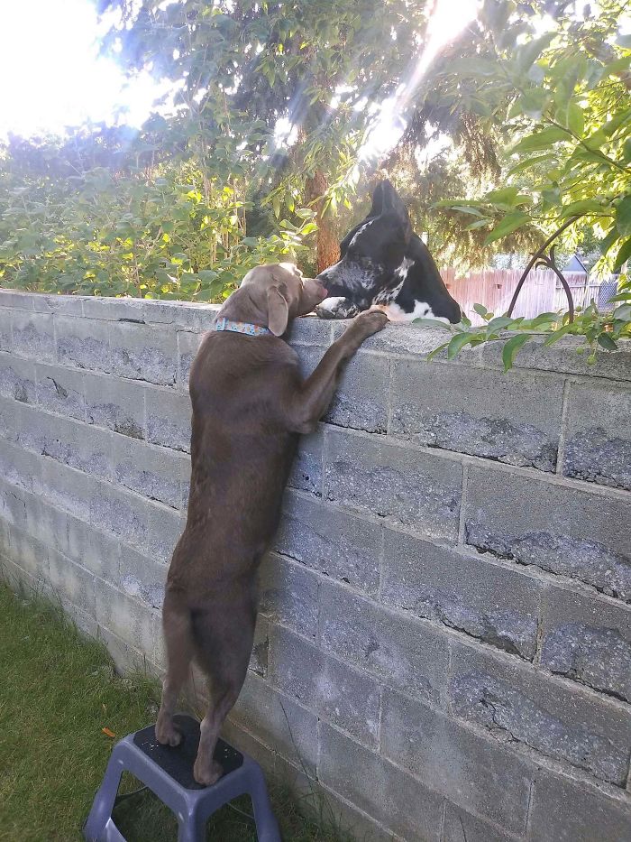 ▼9.「鄰居發給了我這張照片,他幫狗狗擺好了一個小板凳,這樣牠就能夠每天和好麻吉聊天擁抱了。」