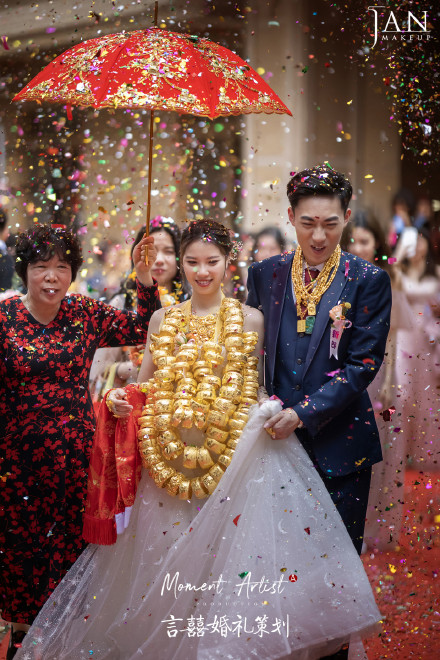 2023年12月08日按照廣東的習俗,晚輩結婚時長輩會送龍鳳手鐲代表祝福,新娘將這些手鐲掛在脖子上,是伴著長輩們的祝福出嫁的意思。最近一組婚禮照片在臉書上瘋傳,只見新娘的脖子上掛著近90隻龍鳳手鐲,她卻笑得淡定從容,似乎一點也不覺得沈重。網友們打趣說,新娘應該頗「硬頸」。