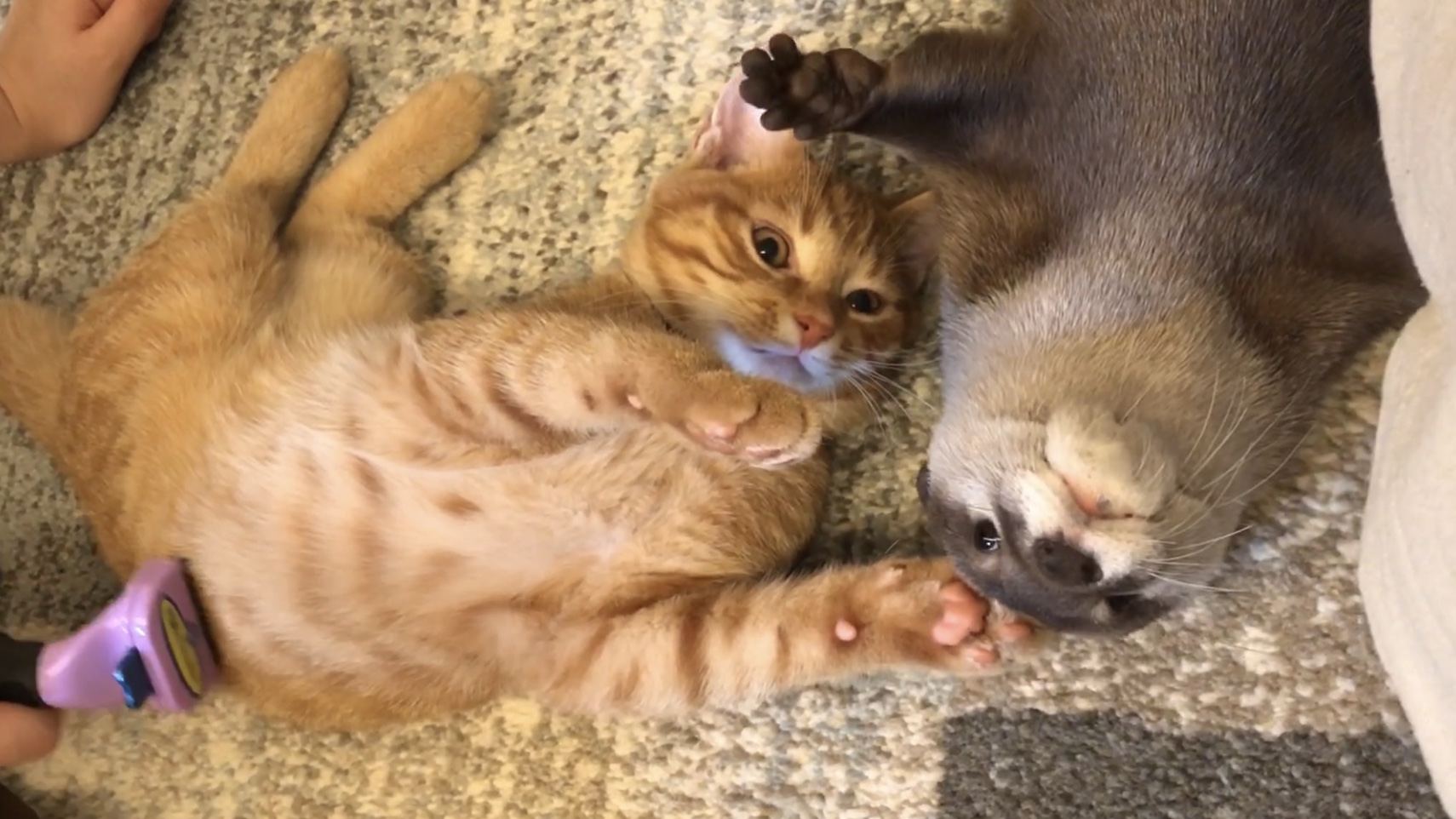 貓咪同化太強!水獺一起玩竟「越來越像貓」 兩隻搶逗貓棒同步趴:預備備~