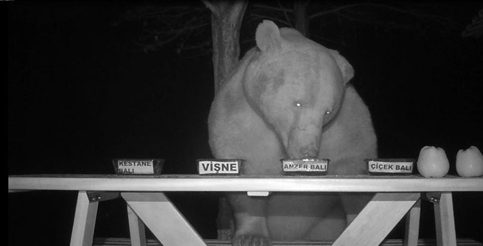 ▼為了了解熊熊的行動模式,Sedef在養蜂場裡架設相機,來觀察牠們的一舉一動。一段時間後Sedef想出了一個好辦法,那就是請熊熊吃蜂蜜!