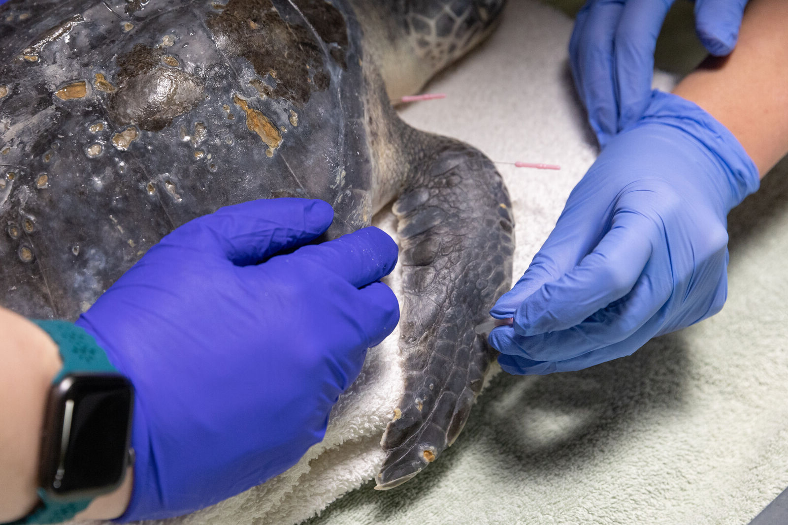 2022年04月22日日前美國國家水族館巴爾的摩分館(National Aquarium in Baltimore)接收了一隻肯氏海龜(Kemp's ridley sea turtle)。工作人員發現,這隻小海龜無法完全張開嘴巴,這會影響牠自行進食,於是便使用針灸的方式進行治療,療效相當好~