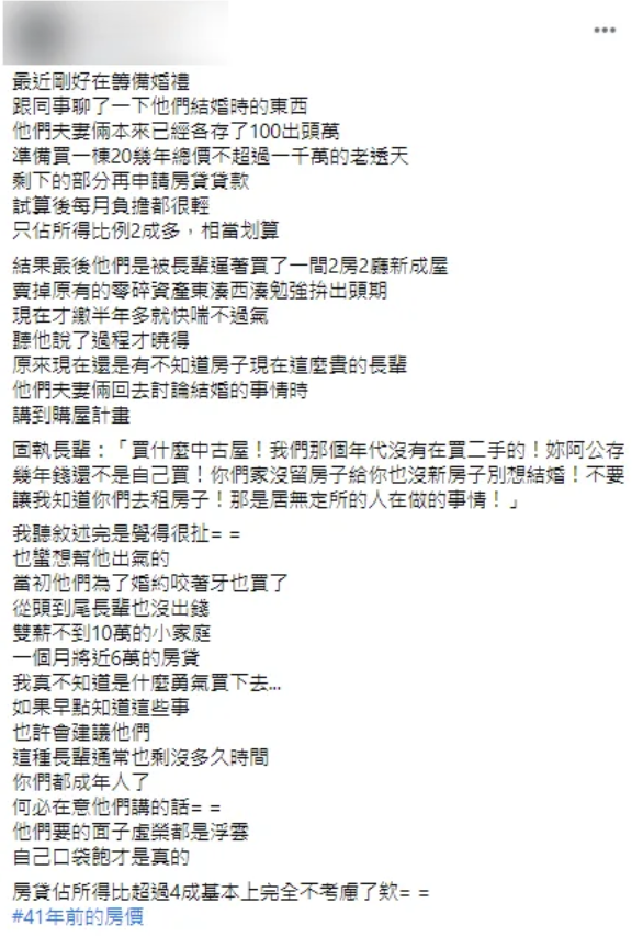 ▼這位網友在臉書社團「爆廢1公社」發文,講述了同事結婚買房時的經歷。同事夫妻當時各存100多萬,準備用這筆錢買一棟屋齡20幾年、總價不超過1000萬元的老透天厝,剩下的部分再申請房屋貸款。雖然每個月要還房貸,但負擔不重。