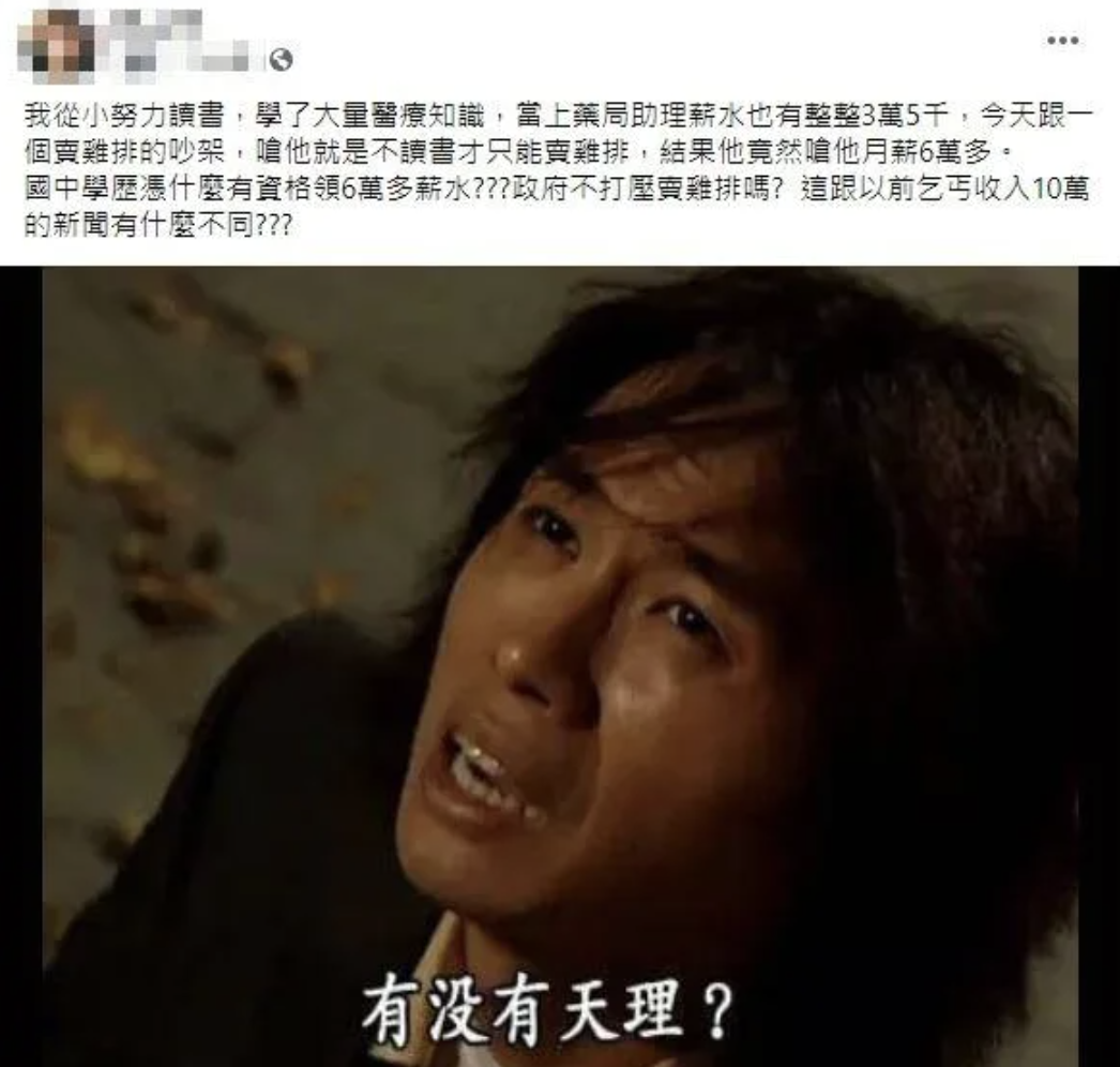 2022年04月22日日前一名藥局助理跟雞排店老闆發生口角,她得知對方月薪60K以上,心中非常不滿。她在臉書社團「爆怨2公社」抱怨,自己努力讀書當上藥局助理,月薪35K,比雞排店老闆賺得少很多,「國中學歷憑什麼領6萬多薪水?」網友們看到後沒有安慰她,反而砲轟「妳可以去賣雞排呀」。