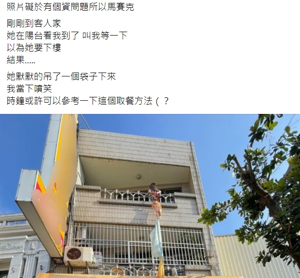 ▼這名外送員在臉書社團「外送員的奇聞怪事」發文說,24日送餐到顧客家時,對方在3樓陽台看她到了,就叫她等一下。她本以為顧客要下樓取餐,沒想到對方默默吊了一個袋子下來。原po忍不住說:「我當下噴笑,時鐘(中)或許可以參考一下這個取餐方法。」