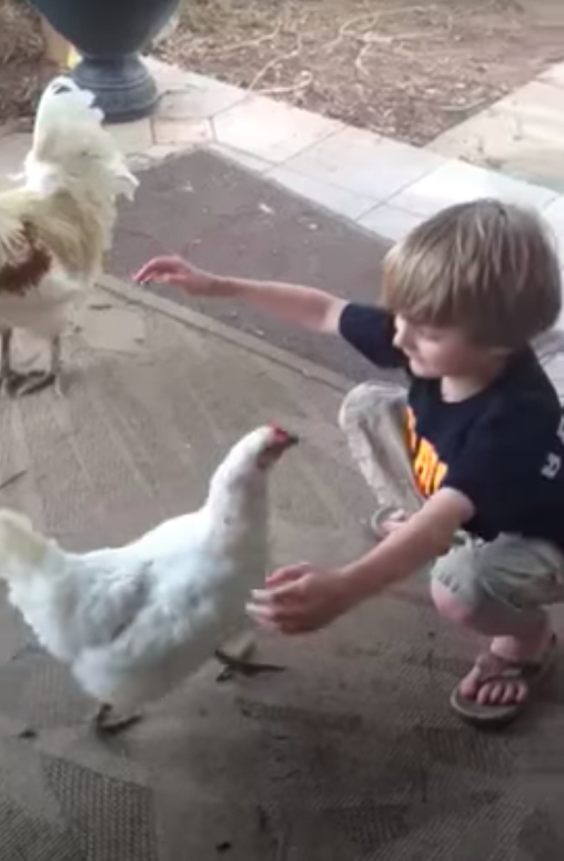 ▼Mason經常在自己的YouTube頻道上分享和母雞擁抱的影片,獲得了不少粉絲的喜愛。在另一段點閱量超高的影片中,Mason剪完頭髮後跟自己的好朋友母雞見面,他像往常一樣開心地蹲下,伸出雙手,邀請母雞來抱抱。沒想到母雞從他的懷裡溜出去,跑到旁邊觀察了一下,先確認過男孩身份,這才回到Mason的懷抱中。