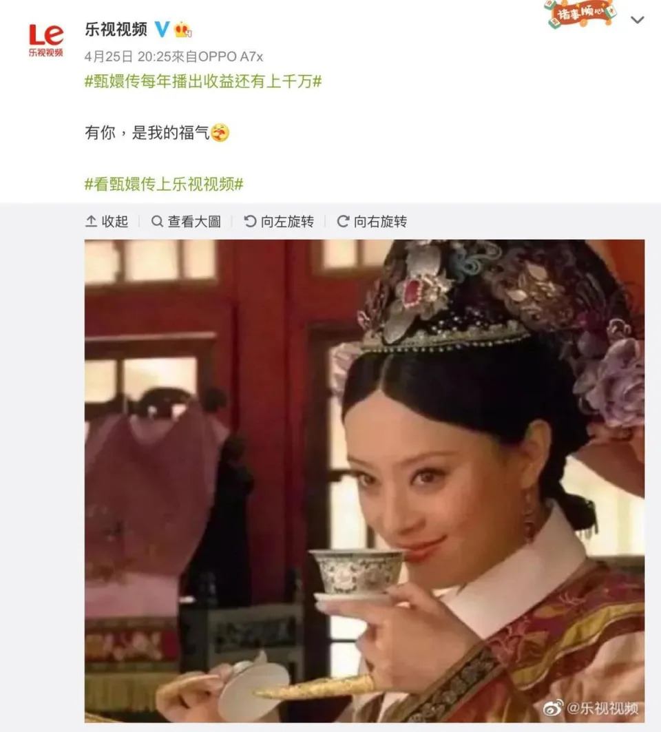 ▼這一消息在網路上傳開後,樂視視頻在微博上po出《甄嬛傳》劇照,說:「有你,是我的福氣。」