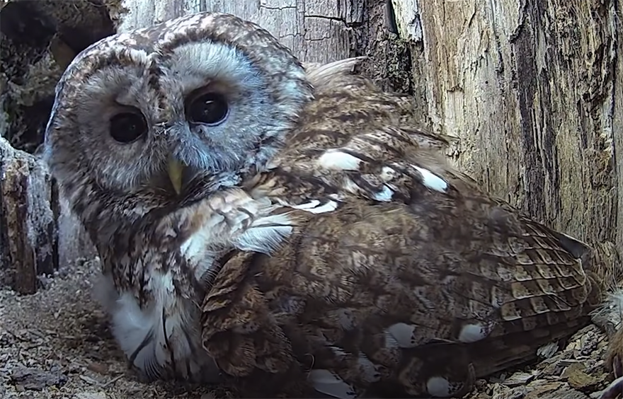 ▼當時2隻灰林鴞寶寶出現在Luna棲身的樹洞裡,牠們一看到Luna回來,就迫不及待發出激動的啾啾聲。Luna看到這2個莫名出現的小孩,瞬間母愛爆發,用翅膀將牠們蓋住,就像將牠們抱在懷裡一樣。Luna非常珍惜這2隻鳥寶,那母愛滿滿的畫面超感人。