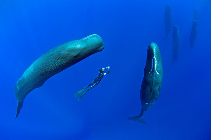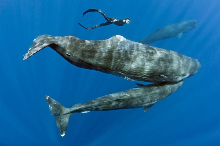 ▼專業的水下攝影師法蘭柯(Franco Banfi)拍下了抹香鯨們睡覺的樣子,牠們會突然同步停止游動,並以垂直的狀態休息。