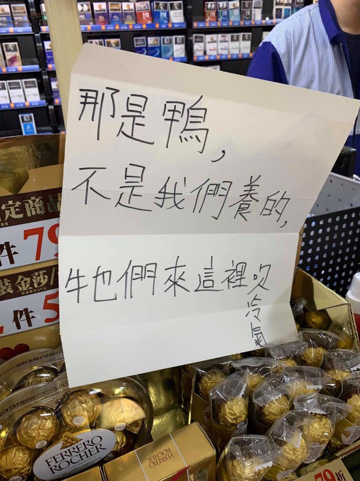 ▼日前有網友在臉書社團po文表示,來到三重三和夜市的一家超商時,發現兩隻完全不怕人的鴨子,大喇喇的站在冰櫃前方。不過當原po看到櫃檯寫著的紙條後,忍不住在臉書上寫道「我只想抱怨一下店員,明明這麼有愛,為甚麼不肯耐心跟好奇顧客一一解釋。」